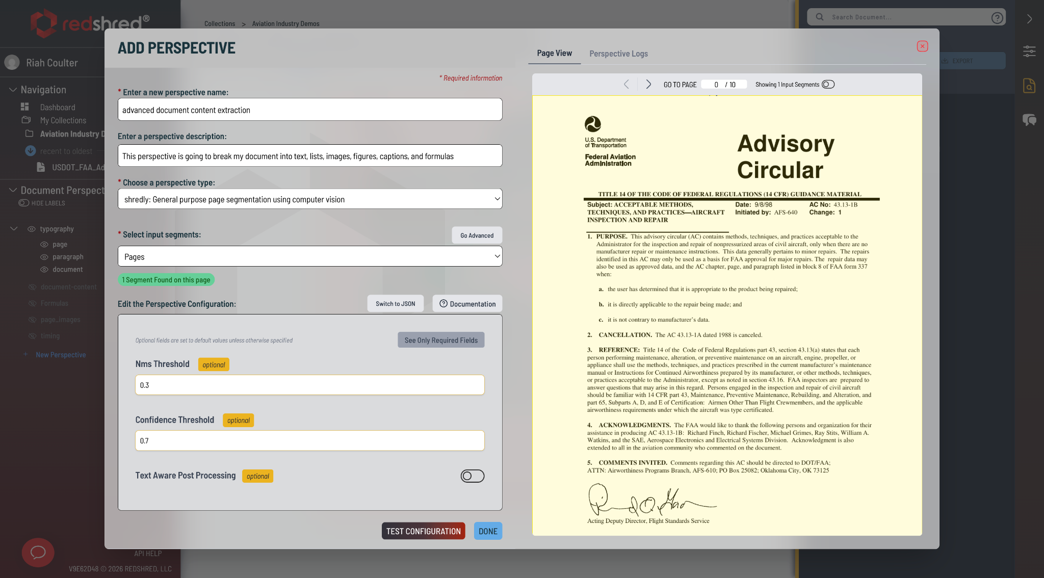 Once you're satisfied with the output, click 'DONE' to save your configured Perspective to your Collection. Redshred will begin processing immediately, and your extracted intelligence will appear on the document as soon as it's ready.