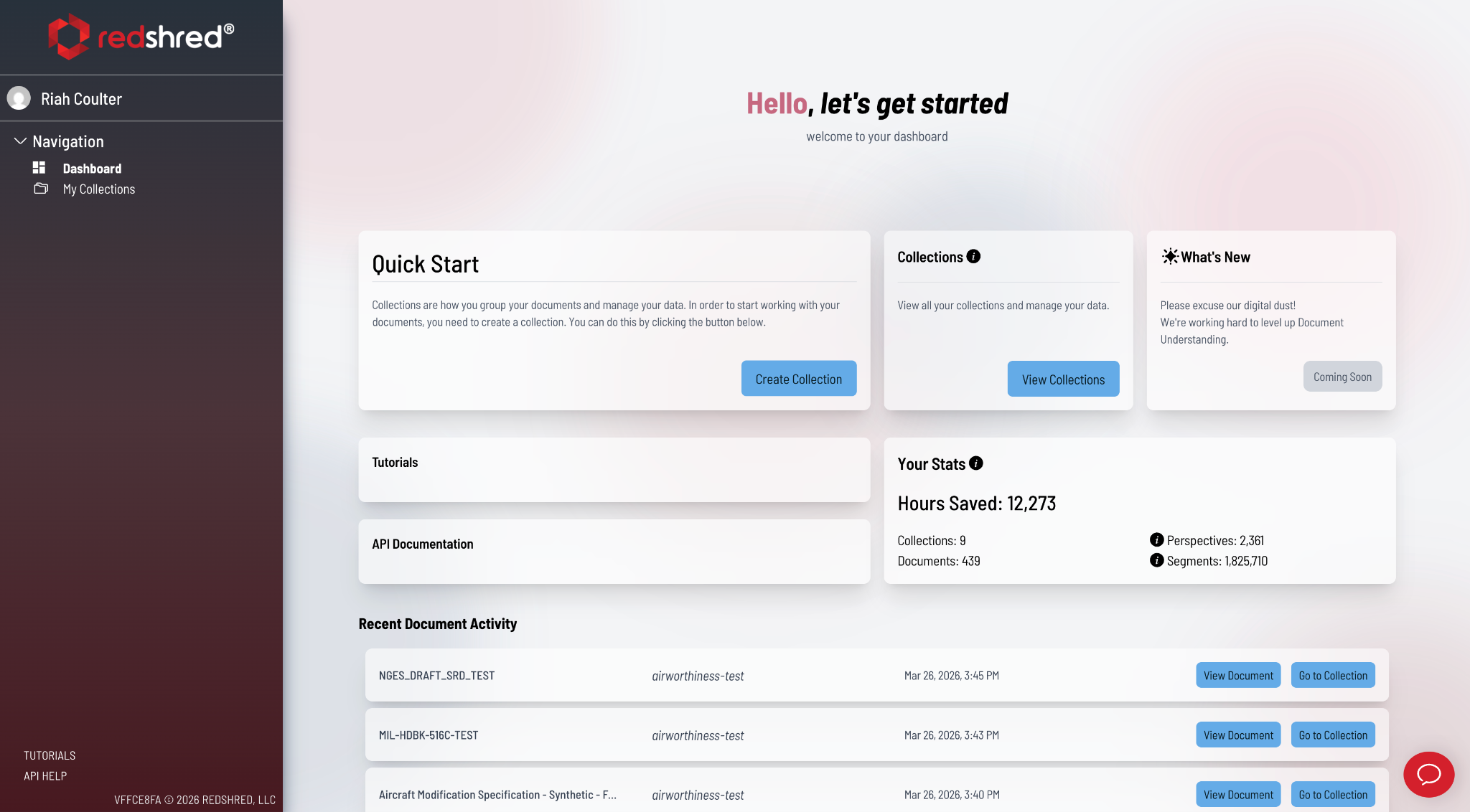 Use your provided credentials to sign into api.redshred.com. Once logged in, you'll land on your Dashboard — your home base for revisiting recent documents, monitoring usage statistics, accessing tutorials and documentation, and taking quick actions.